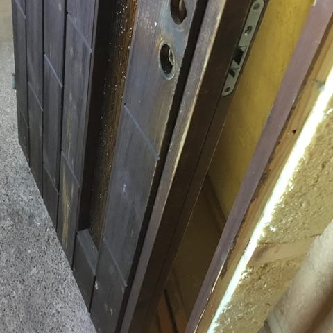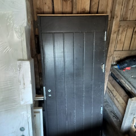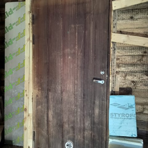 Massiivipuinen ulko-ovi, jossa pystypaneloitu pinta ja kapea lasiaukko pitkällä sivulla. Oven toinen puoli on ruskea ja toinen valkoinen. Ovessa on uusi lukkorunko.Oven karmin koko: