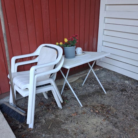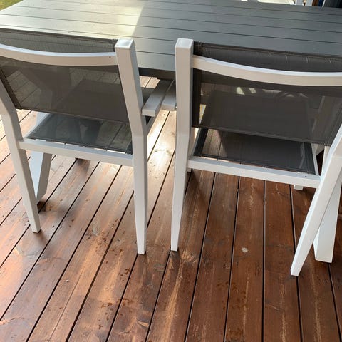 Puutarhakalustesetti, johon kuuluu pyöreä metallirunkoinen pöytä lasikannella, neljä taittuvaa tuolia sekä aurinkovarjo. Aurinkovarjo on käyttämätön. Valkoinen maalipinta hilseilee joten vaatii kunnon puhdistuksen ennen käyttöä.