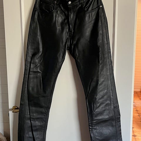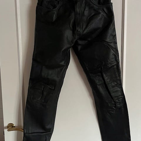 Myydään hieman polvista kuluneet nahkahousut. Paksua nahkaa. Paino 1,3 kg. Mitat näkyvät kuvissa. Postitus tai nouto. Postimaksu 12,-. Maksu käteisellä tai MobilePayllä.