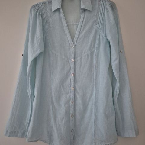 Kauniin farkun sininen paita, metallinapein, pikkutaskuin, rypytyksin.