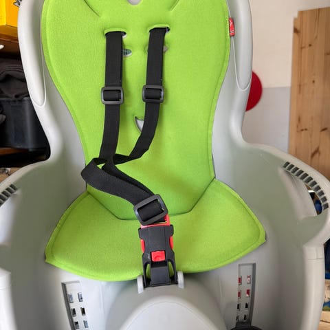 Bellelli merkkinen lasten polkupyörän istuin 22kg saakkka. Istuimessa on selkänoja, turvavyöt ja jalkatuet, joissa on säädettävät jalkahihnat. Toisen puolen ”nilkkaremmmin” lukitusnappula katkennut, mutta voi silti käyttää (näkyy kuvassa). Istuimen kiinnitys tapahtuu runkoon kiinnitettävällä telineellä, joka näkyy kuvissa. Soveltuu lapsen kuljettamiseen polkupyörän takana valmistajan paino- ja kokosuositusten puitteissa.
