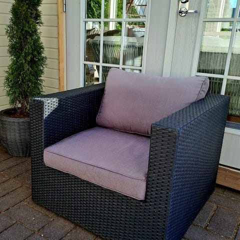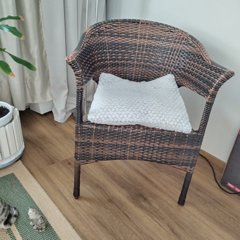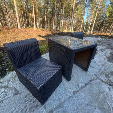 Virheettömät polyrottinkituolit 2 kpl. Korkea selkänoja ja punottu pinta. Irrotettavat, vaaleat/valkoiset istuintyynyt, jotka kiinnitetään nauhoilla selkänojan taakse. Päälliset voi irroittaa ja pestä. Käytetty sisällä ja lasitetulla parvekkeella. Hinta yhteensä 30€.