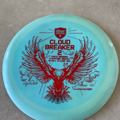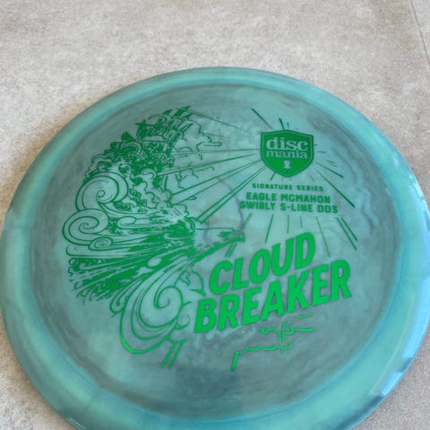 Discmania Cloud Breaker -frisbeegolf-kiekko. Kiekossa on vihertävä pohjaväri ja sininen kuviointi yläpuolella. Sopii frisbeegolfin pelaamiseen esimerkiksi draiverina. Materiaali on kovaa muovia, joka kestää toistuvaa käyttöä. Kiekon alapuolella on viivakooditarra ja merkintä painosta.