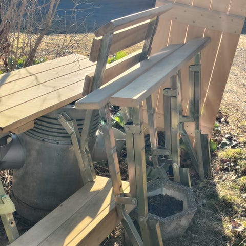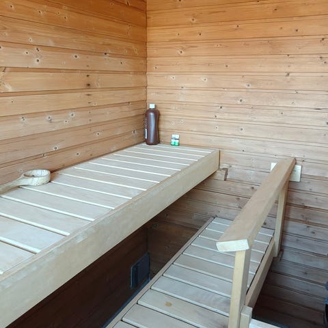 VARATTU Puiset lauteet (vaakeaa puuta, leppää?) . Kaksi lausetta ja porrasjakkara sekä suojakaide leveys 81cm. Lauteiden leveys 169cm. Ylälauteen syvyys 65 cm .