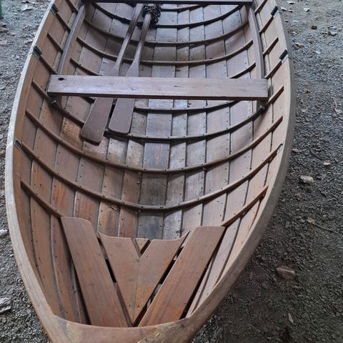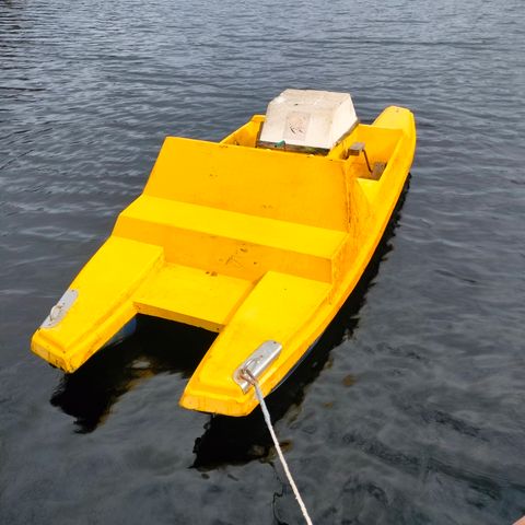 Pelican-polkuvene. Puu kaatunut päälle. Esim. lasikuidulla korjattavissa. Joitakin irronneita palasia tallessa.