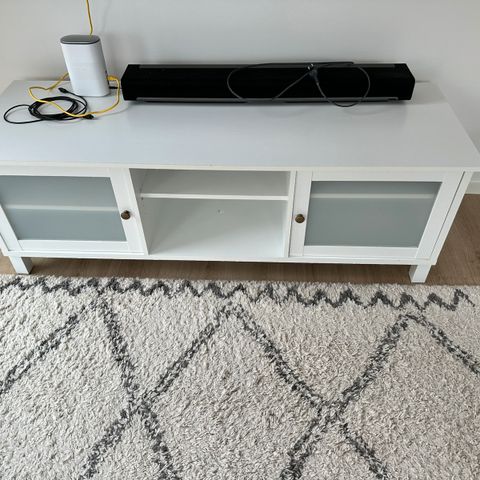 Valkoinen tv-taso, jossa kaksi lasiovea ja avoin keskiosa. Lev. 145cm, syv. 50cm. Joitakin kulumia löytyy.