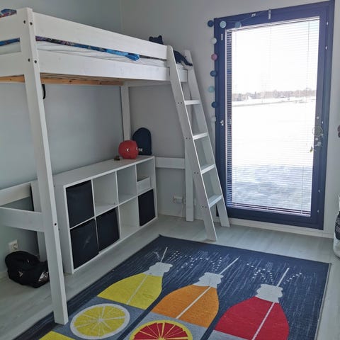 Tukeva parvisänky. Patjan koko 80 x 200cm. Rungon pituus 218cm, leveys 87cm ja korkeus 185cm. Tikkaat voi sijoittaa mihin kohtaan haluaa, päätyyn tai pitkälle sivulle. Käytön jälkiä löytyy. Uutena näissä lienee ollut pöytälevy alla mutta sitä ei ole tallessa.