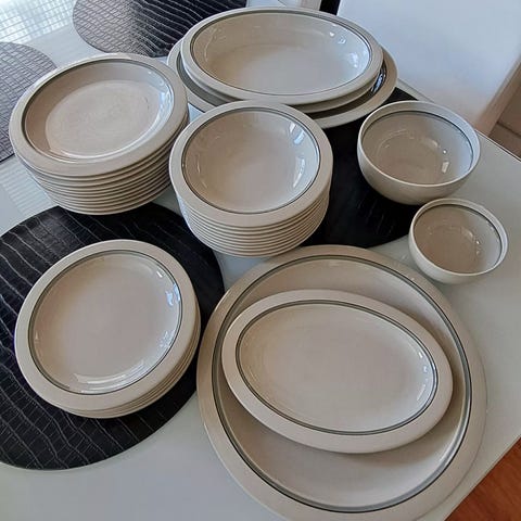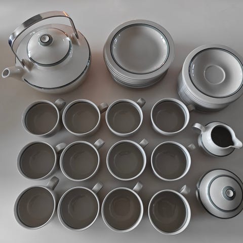 Arabia astiasto, johon kuuluu matalia ja syviä lautasia(6+6), kahvikupit + lautaset / leipälautaset(6+6),jälkiruokakulhot(6), tarjoilulautanen sekä kermakko ja sokerikko. Astiat ovat vaaleaa sävyä, reunassa hillitty koristelu. Sopii arki- ja kattauksiin, joissa tarvitaan peruslautasia, kulhoja sekä tarjoiluastioita kermalle ja sokerille.