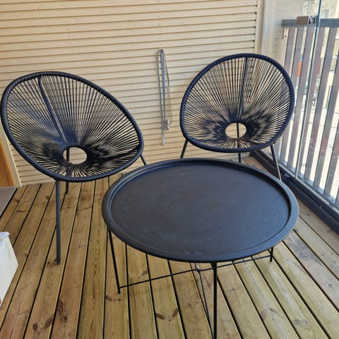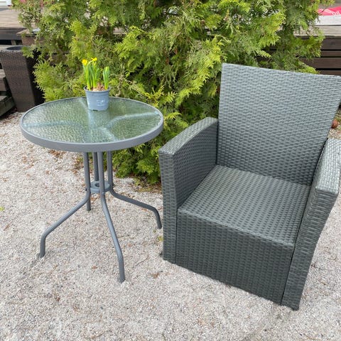 Kalustesettiin kuuluu pyöreä pöytä ja neljä tuolia. Pöydässä on musta lasikansi ja sen runko sekä tuolien rungot ovat metallia. Pöydän halkaisija on 100 cm. Tuolit ja pöydän alaosa ovat polyrottinkia, väriltään mustat. Sopii ulkokäyttöön esimerkiksi parvekkeelle tai terassille.