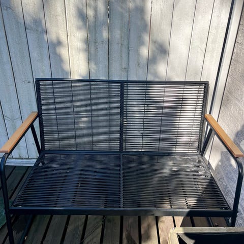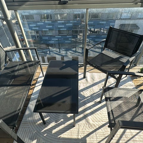 Parvekekalustesarja, johon kuuluu kaksipaikkainen sohva, kaksi käsinojallista tuolia ja pyöreä pöytä. Rungot ovat mustaa metallia ja käsinojat puunsävyiset. Istuimissa on tummat pehmusteet. Sopii esimerkiksi parvekkeelle tai terassille.