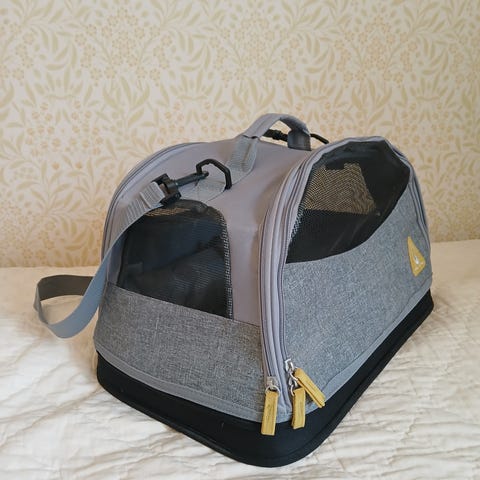 Technicolor-kantolaukku pienelle tai keskikokoiselle kissalle. Laukku on tehty nailonista ja siinä on kolme avattavaa ovea, verkkoikkunat kolmella sivulla ja irrotettava pohja. Mukaan saa halutessaan sisällä olevan huovan lisäpehmusteeksi. Huopa on kyllä melko karvainen edellisen asukin jäljiltä. Koppa on muutenkin käytön jäljiltä, mutta ehjä. HUOM! Kantohihna on kadonnut jonnekin. Uuden hinta 28e.