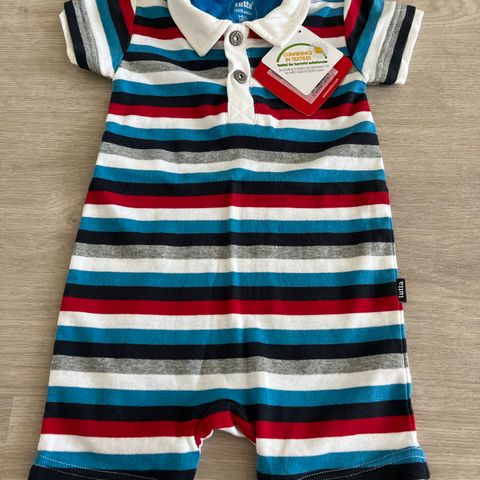 Dirkje vauvojen shortsiasu, koko 62. Valkoinen T-paita kuvalla ja harmaat shortsit. Ollut kerran päällä eli käytännössä kuin uusi.