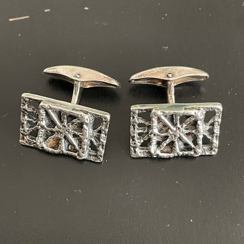 Myydään vintage-ikäiset 830-hopeiset kalvosinnapit. Nämä pitsi-kalvosinnapit on suunnitellut Pentti Sarpaneva ja valmistaja on Turun Hopea. Koristeosan leveys on 19mm ja korkeus 13mm.