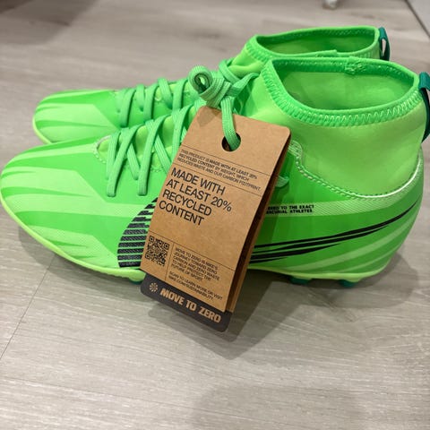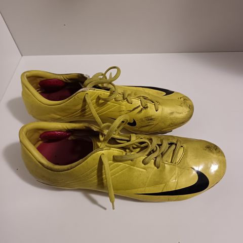 Nike mercurial jalkapallokengät nappulapohjalla. Violetti‑valkoinen väritys punaisilla yksityiskohdilla ja Nike‑logoilla. Pohjassa muovinappulat luonnonnurmelle. Nauhakiinnitys. Koko 38,5.