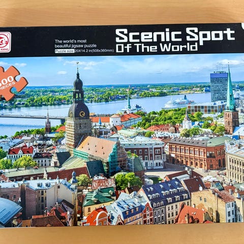 Scenic Spot of the World palapeli, jossa on 500 palaa. Kuvassa on alppimaisema, jossa näkyy vuoria, maalaistaloja ja vihreää niittyä. Palapeli on tarkoitettu ajanviettoon ja kokoamiseen pöydällä tai muulla tasaisella alustalla. Sopii palapelien harrastajille ja maisemakuvista pitäville.