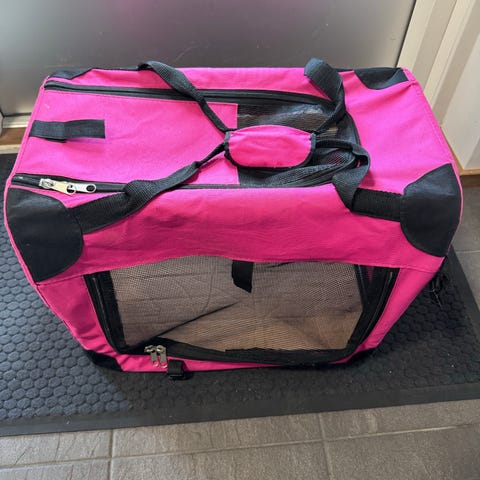 Koiran kankainen kuljetushäkki violettia kangasta. Häkissä on useita verkkoseinämiä ilmanvaihtoa ja näkyvyyttä varten sekä vetoketjulliset aukot sivuilla ja päällä. Pohjalla on irrotettava pehmuste. Häkki on kokoontaitettava ja mukana on kantokahvoilla varustettu suojapussi säilytystä ja kuljetusta varten. Soveltuu koiran tilapäiseen majoitukseen ja kuljettamiseen esimerkiksi matkalla tai näyttelyissä.