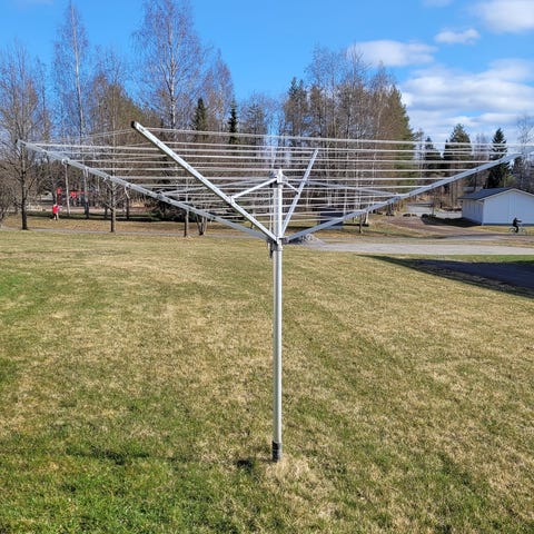 Pyykinkuivausteline ulkokäyttöön. Malli on maahan asennettava, keskijalalla seisova ja usealla varrella varustettu niin sanottu pyörivä pyykinkuivausteline. Väri on vihreä. Sopii pyykin kuivaamiseen pihalla tai puutarhassa. Telineen korkeus ja varret tarjoavat useita metrejä narutilaa vaatteille ja liinavaatteille.
