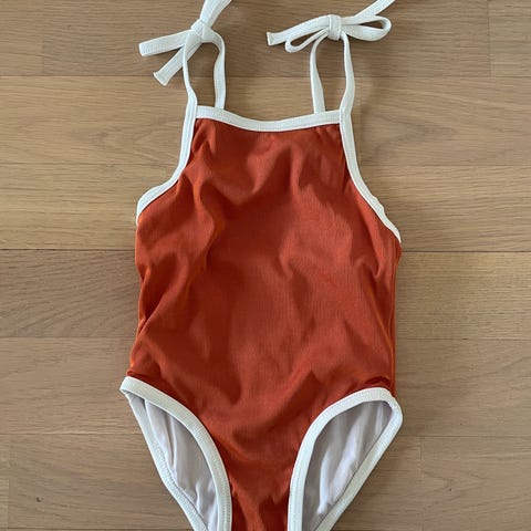 Next uimapuku lapselle, koko 80. Materiaali polyesteriä. Kuosina sinisävyiset raidat ja punaiset rapukuviot. Edessä vetoketju helpottamassa pukemista ja riisumista. Soveltuu käytettäväksi uimahallissa tai rannalla.