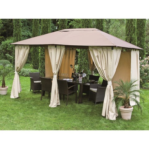 Antiikinruskean värinen, metallinen pergola puutarhaan. Koko 4 x 3 x 2,5 metriä. Käytettävissä esimerkiksi omakotitalon pihan tai puutarhan köynnösseinänä tai kevyenä rajauksena. täydellinen valinta ruusuille ja köynnöskasveille puutarhassa, patiolla ja terassilla.