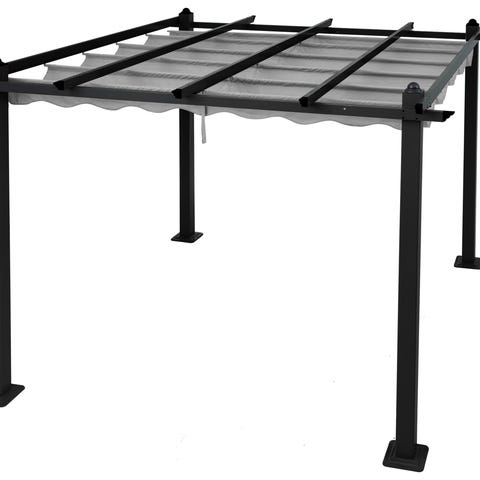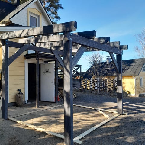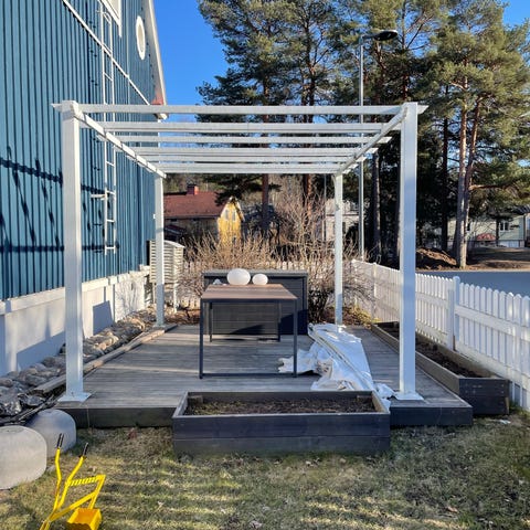 Takorautakehyksestä valmistettu pergola antaa tukea köynnöskasveille. Kauniit koristeet antavat pergolalle romanttista tuntua ja se lisää eleganssia kuistillesi tai takapihallesi. Kun tämä pergola on kasvanut kasveja täyteen, se tarjoaa sinulle ihanteellisen varjoisan paikan kesäisin.