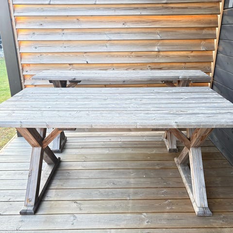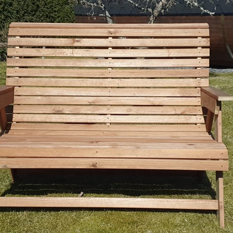 Puutarhakalustesetti, johon kuuluu kahden hengen puinen penkki integroidulla pöydällä. Penkissä on kaksi erillistä istuinpaikkaa käsinojilla sekä väliin sijoitettu pöytätaso, jossa on reikä mahdolliselle aurinkovarjolle. Materiaalina on ruskeaksi käsitelty puu, joka soveltuu ulkokäyttöön esimerkiksi terassille tai parvekkeelle.