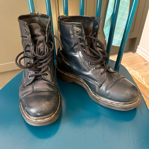 Dr. Martens Shriver Hi, koko 39 (EU). Mustat nauhalliset nahkamaiharit, joissa on paksu korollinen pohja ja klassinen keltainen tikkauksella viimeistelty reunus. Kunto hyvä, nahassa jonkin verran käytön jälkiä.