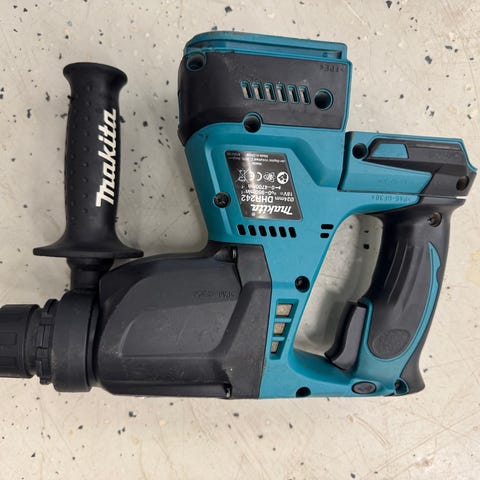 Makita DHR242 poravasara. Akkukäyttöinen poravasara SDS-plus-istukalla. Rungossa valintakytkin eri työtiloille (porauksen ja piikkauksen asetukset). Mukana Makita-laturi. Väriltään sininen mustin yksityiskohdin. Soveltuu betonin, kiven ja muiden kovien materiaalien poraamiseen ja kevyisiin piikkaustöihin yhteensopivilla terillä ja talttoilla.