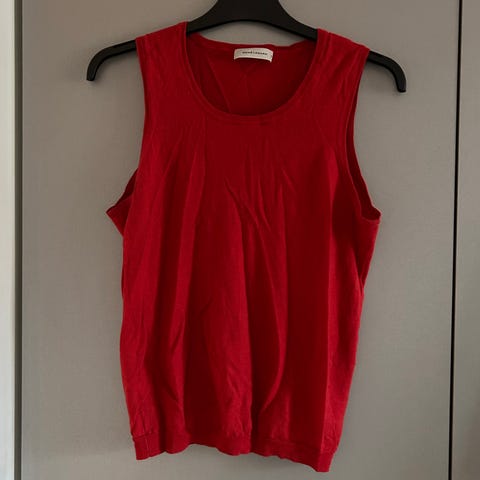 Nanson pusero/liivi. Koko M. Väri punainen. Materiaali: puuvilla 80% ja Villa 20%. Neulottu pinta. Hihaton malli, pyöreä pääntie ja sivuissa pienet halkiot. Sopii käytettäväksi esimerkiksi kerrospukeutumisessa paidan tai puseron päällä.