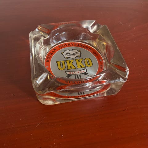 Lasinen tuhkakuppi hirviaiheinen 2 kpl. Lautasissa on metsä- ja hirvikuvitus sekä Kaiku 1954 -merkki. Valmistaja Taitolasi Rauma.