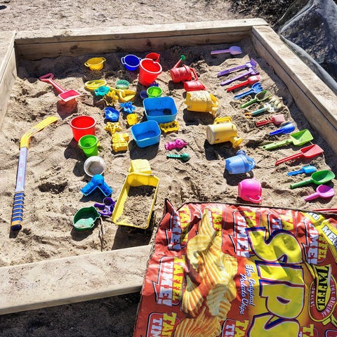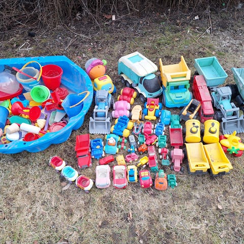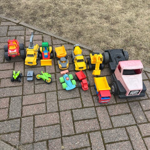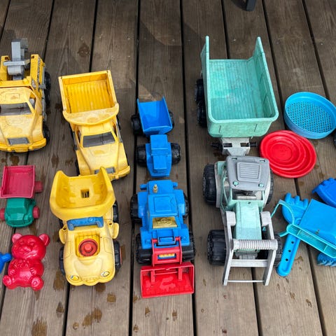 Säkillinen hiekkaleluja (kaikki kuvassa näkyvät). Mukana useampia plasto autoja ja plasto kola. Tästä hyvä setti heti kauden alkuun.