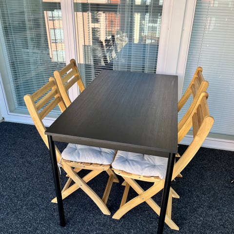 Kohtalaisen kuntoinen setti pöytä ja tuolit. Ihan toimiva, mutta iäkäs ja kaipaa pesua. Hieman taipuneet laudat pöydässä. On muutaman kerran öljytty niin puu ei ole päässyt hapristumaan. Mukaan valkoiset hyväkuntoiset pehmusteet.