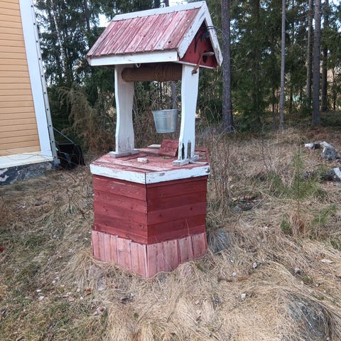 Koriste kaivonkannelle halk. n.110cm 6-kulmainen, pohjamaalattu musta/punainen, nira metallinen pumppu.