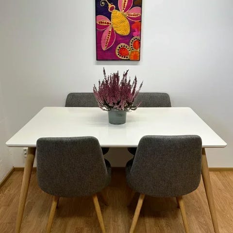 Valkoinen ruokailuryhmä 6 tuolia kork. 84 cm lev.noin 49cm syvyys 41cm selkänojan kork. 42cm