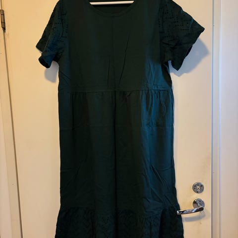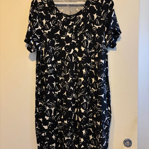 Nosh Maranta-mekko, koko XL. Pesty, mutta käyttämätön. Materiaalina 100 % puuvilla. Mekossa on kirjavan sävyinen kuosikangas, lyhyet hihat ja pyöreä pääntie. Vyötäröllä on kevyesti muotoileva leikkaus sekä taskut.