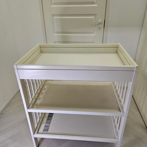 Valkoinen IKEA Gulliver -hoitopöytä ja hoitoalusta. Hyväkuntoinen ja laadukas, jämäkkä pöytä. Muuten uudenveroinen, paitsi hoitoalustan alla pinta irronnut kahdesta kohdasta (ks. kuva).