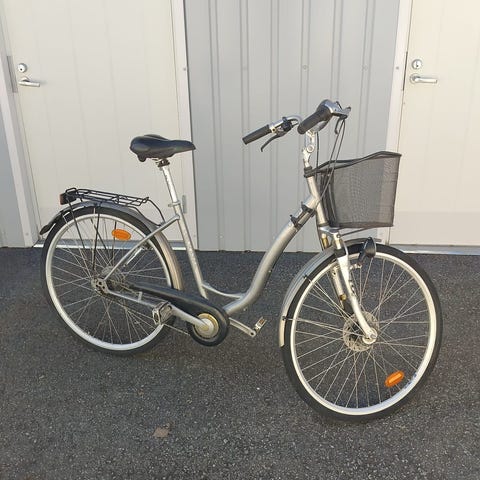 Helkama kaupunkipyörä naisille, 28" (700c) renkaat. 3 vaihdetta. Pyörässä on tavarateline takana, lokasuojat ja pumppu.