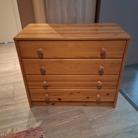 Tukeva, laatikot saa kokonaan pois, pientä pintavikaa, pintanaarmuja, näkyvimmät on viilusta pikku palat pois sivulevyjen alakulmista, toisen sivulevyn alareunassa keskeltä ja yhden laatikon alareunasta (nyt alimmaisena) kuvista näkee aika hyvin zoomaamalla. Isoimmat liat putasattu, parempi siistiminen ostajalle. Ei tasaisen punainen, väri vaihtelee erityisesti etulevyissä.