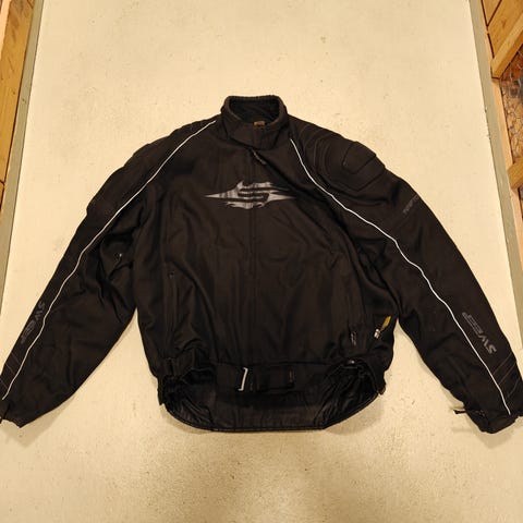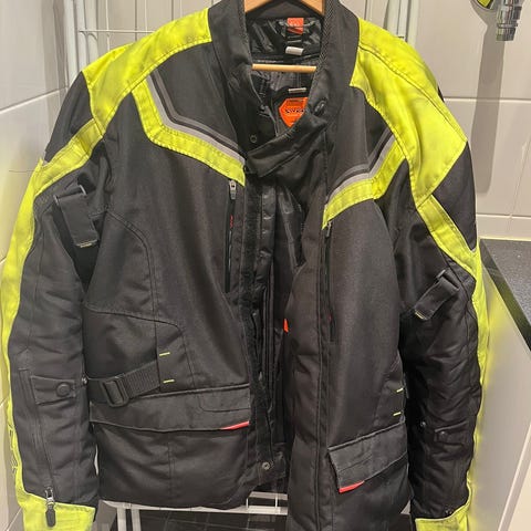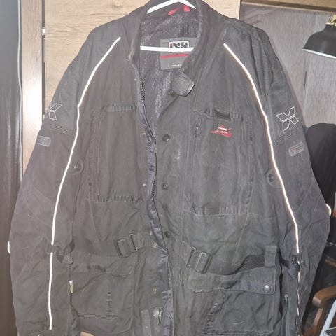 Oranssi ajotakki koossa 4XL. Takissa on useita merkki- ja logotarroja edessä ja hihoissa sekä heijastinnauhoja. Materiaali on sileää, synteettistä kangasta. Takissa on korkea kaulus ja tarrakiinnitykset helmassa ja hihansuissa istuvuuden säätöön. Sopii moottoripyörä- tai muun ajovarustuksen päällystakiksi. Ihan siisti ollut pari kertaa päällä