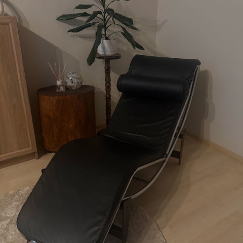 Mustaa nahkaa oleva lepotuoli.