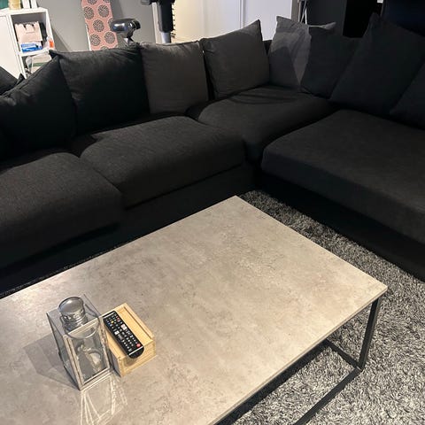 Askosta ostettu todella mukava iso kulmasohva. Siisti ja ehjä. Pidempi osa n. 280 cm, lyhyempi n. 220 cm, syvyys n. 85 cm. Irrotettavat ja pestävät päälliset sekä istuin- että selkänojatyynyissä. Lisäksi kaksi sohvatyynyä. Taloudessa ei kotieläimiä. Menee kahteen osaan. Lyhyempi osa menee hissiin, mutta pidempi osa kannettava alas (5. kerros).