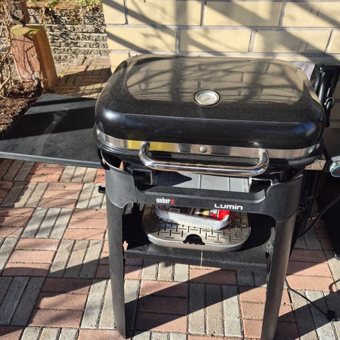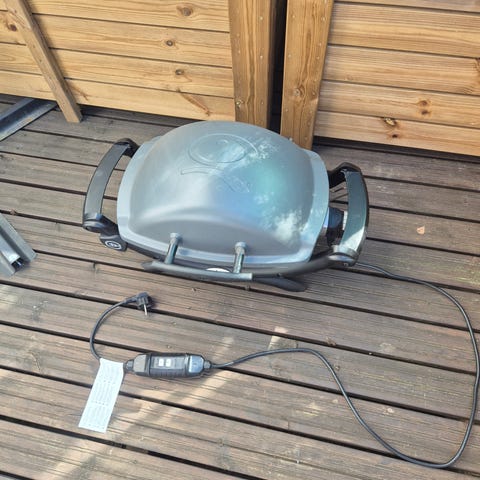 Myydään sähkö grilli Weber Q140, jalusta, jossa pyörä ja suojapeite.