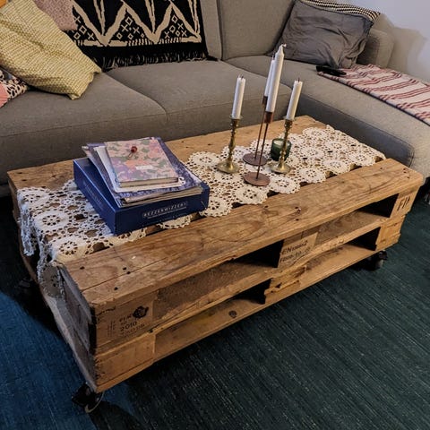 Hieno industrial-tyyppinen sohvapöytä. Pöytälevy puuta. Metalliset jalat.