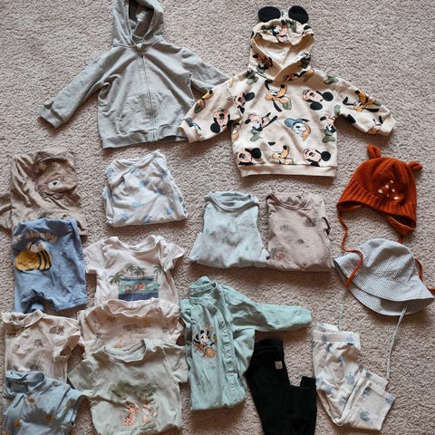 Kuvissa näkyvät vaatteet. Tummumaa ja pesunukkaa sekä hyvin haaleita tahroja voi löytyä, en syynännyt. Hyvässä käyttövaate-kunnossa. Ruskeat housut kokoa 62/68 muista koista poiketen. Saa noutaa kontaktittomasti myös kotoani Turengista.