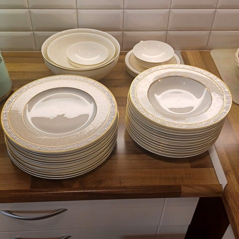 Kokonaisuuteen kuuluu teemukeja, kahvikuppeja, pullalautasia ja aluslautasia, tarjoilulautaset sekä kermakko ja sokerikko.