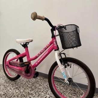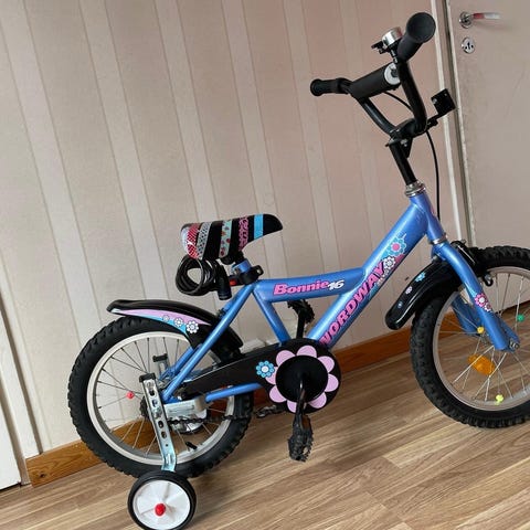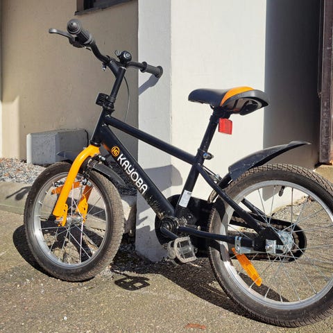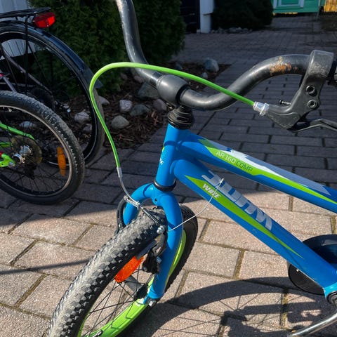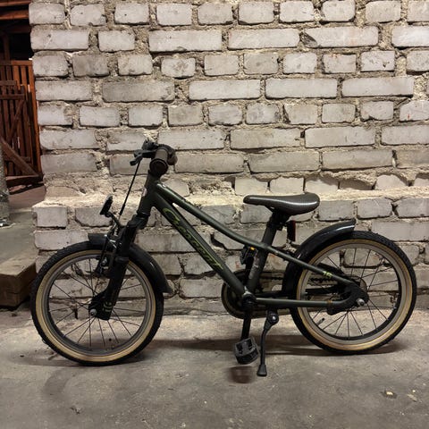 Kohtuullisessa kunnossa oleva stoy lastenpyörä 16 tuuman koossa. Edessä käsijarru ja takana jalkajarru. Etujarru toimii, mutta jarrupalat kaipaavat uusimista.