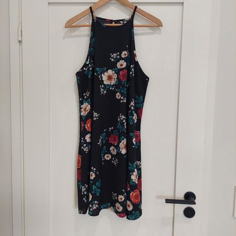kesämekko naisille, koko M. Hihaton, väljä ja pitkä malli, jossa pyöreähkö pääntie pienellä halkiolla edessä. Materiaalina polyesteri. Mekossa on musta pohjaväri ja suuri graafinen monivärinen kuvio edessä ja takana. Sopii arki- ja vapaa-ajan käyttöön lämpimään säähän.