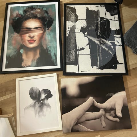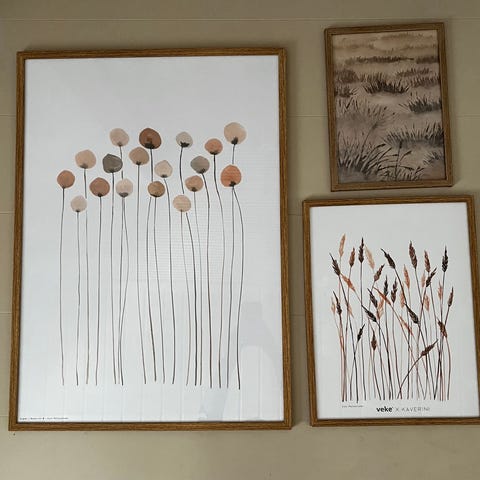 Kaikki kuvissa näkyvät kehykset ja taulut yhteensä 20e. Suurimman (ruskea) kehyksen koko 60cm x 65 cm. Nouto Tampereelta.