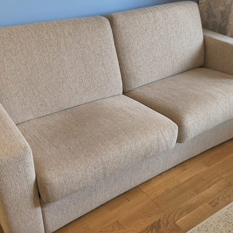 Vaalea kangasverhoiltu vuodesohva. Vuoteen koko kun molemmat osat avattu: 155cm x 190 cm. Erittäin painava, omat kantajat mukaan (1.kerros).