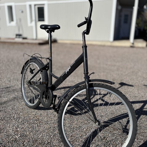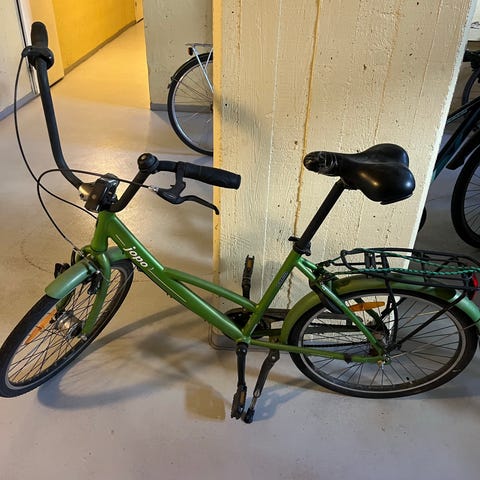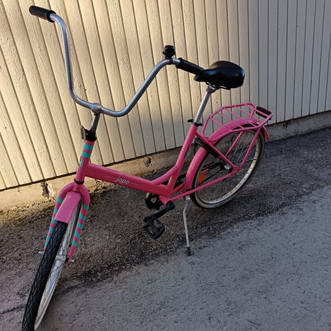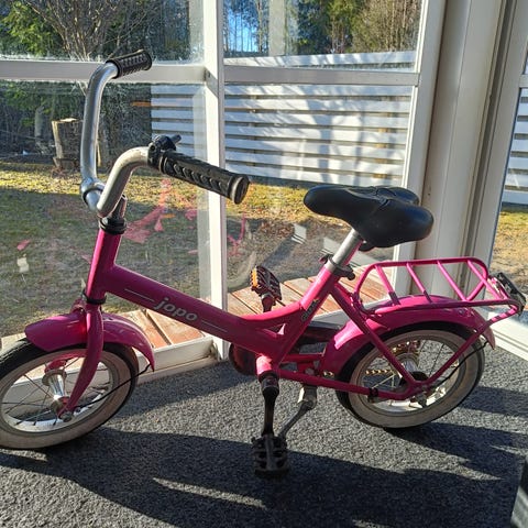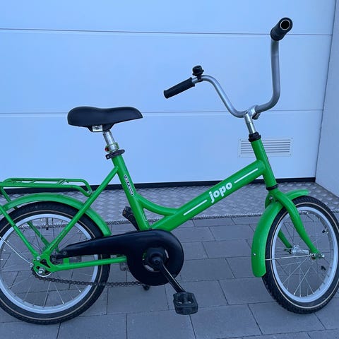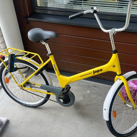 Jopo 16". Pyörässä on 16 tuuman renkaat ja keltainen runko. Varustettu takatavaratelineellä, ketjusuojalla ja jalkajarrulla. Soveltuu lapselle, jolle 16 tuuman rengaskoko on sopiva.