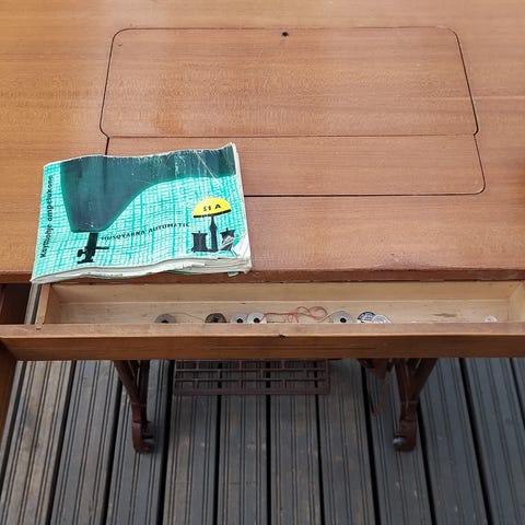 Ompelukonepöytä, jossa metallinen jalusta ja suorakaiteen muotoinen puukansi. Jalusta on poljettava malli, jossa on alkuperäiset metalliosat ja ritiläjalka. Pöytää voi käyttää esimerkiksi pienenä sivupöytänä, työpöytänä tai sisustuselementtinä. Soveltuu sisä- tai katettuun ulkokäyttöön materiaalien kunnon ja käsittelyn mukaan.